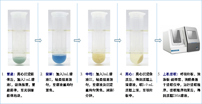 本试剂盒基于经典碱裂解法和磁性微纳米复合粒子的核酸提取技术,实现大量菌液样本高纯度质粒 DNA的提取和纯化。所提取的质粒DNA可用于